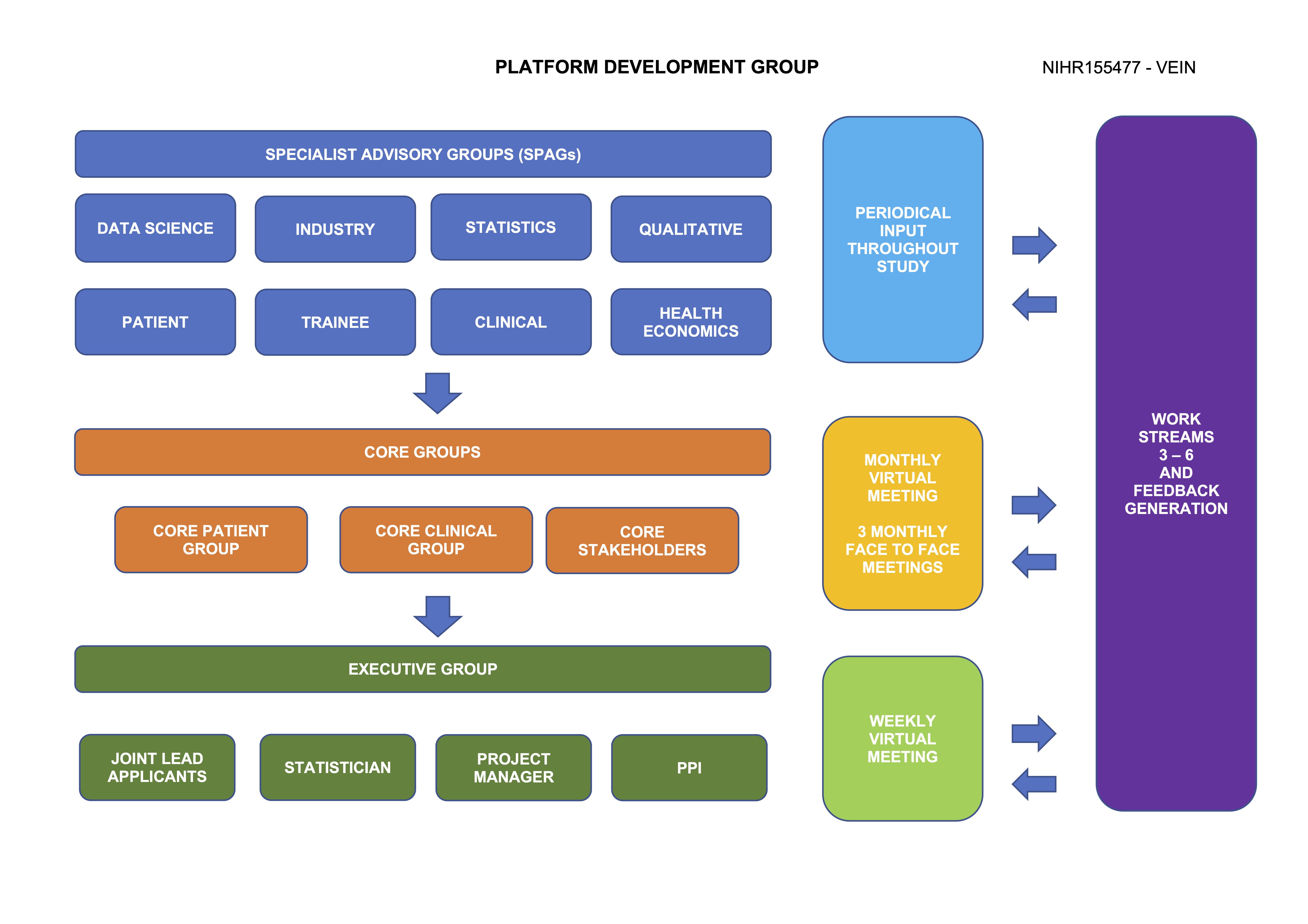 Specialist Advisory Groups (SPAGs): Additional stakeholders who advise the core groups on platform development via surveys, questionnaires and focussed interviews, where appropriate.