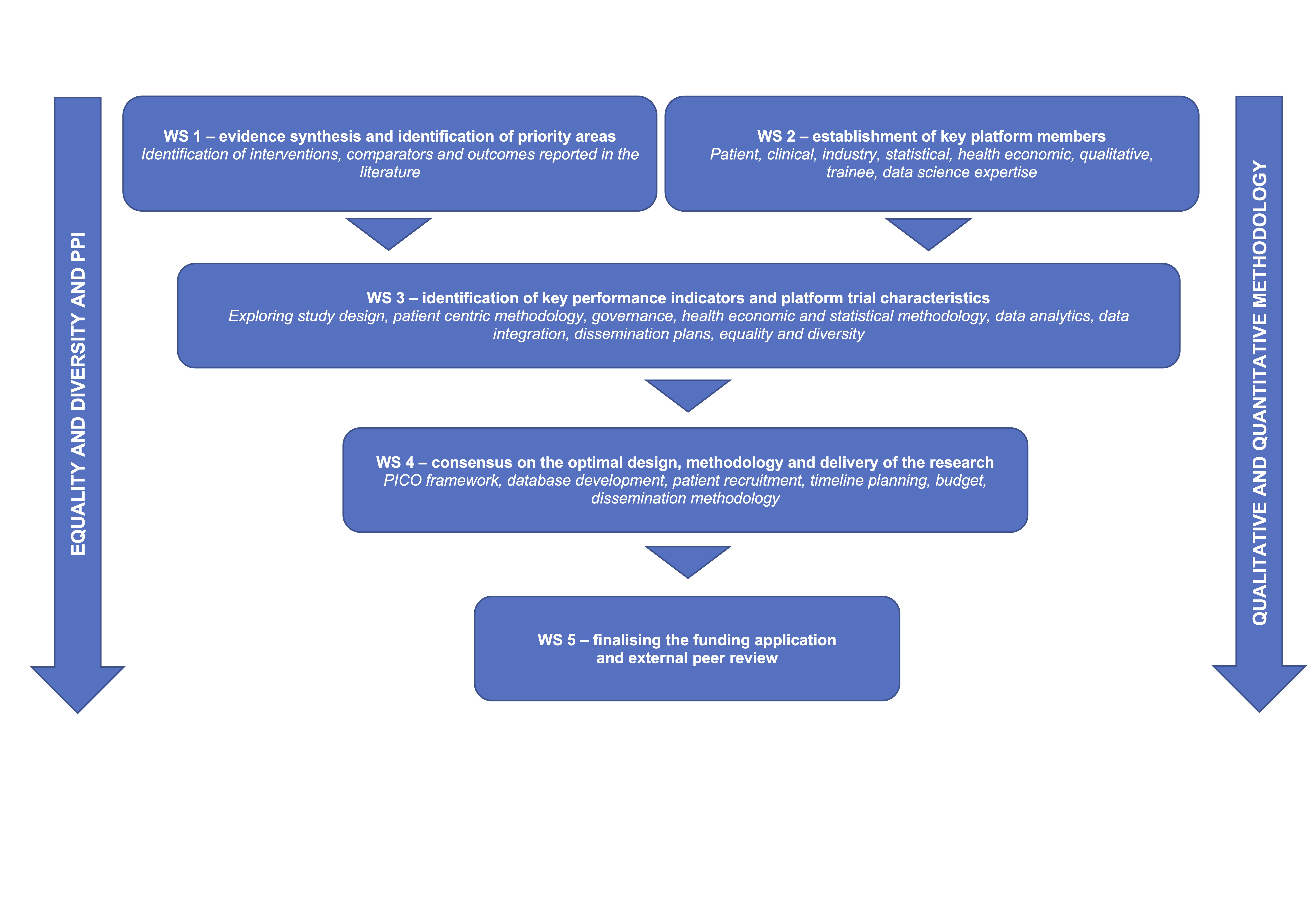 Qualitative expertise: Qualitative methodology featured heavily during platform development. WS 3-6 relies on focus groups and structured interviews to help establish trial characteristics. Qualitative experts and behavioural health psychologists join appropriate meetings to identify themes and categories to ensure the maximum amount of data can be distilled from group encounters.