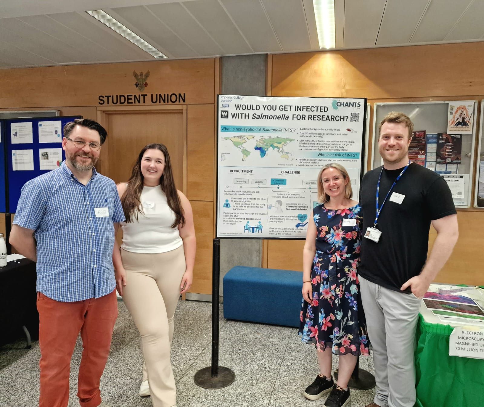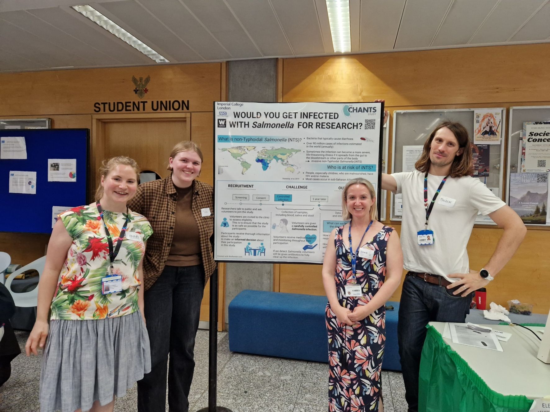 The study we were talking about was the CHANTS study. In this study, led by Dr Malick Gibani at Imperial College London, we are deliberately challenging healthy adult volunteers with a type of Salmonella called NTS. This challenge involves giving participants a drink containing a known dose of the bacteria. This mimics the natural way people catch the infection (through ingesting contaminated food or water). The goal is to develop a clinical model to be able to test new Salmonella vaccines in volunteers.