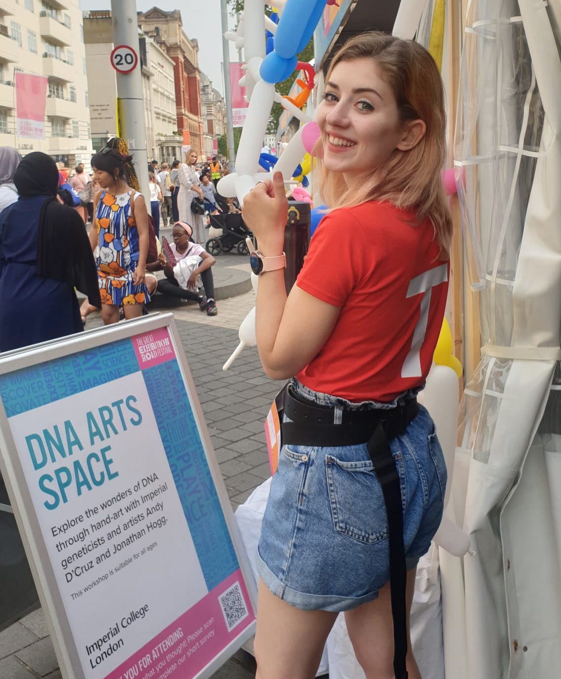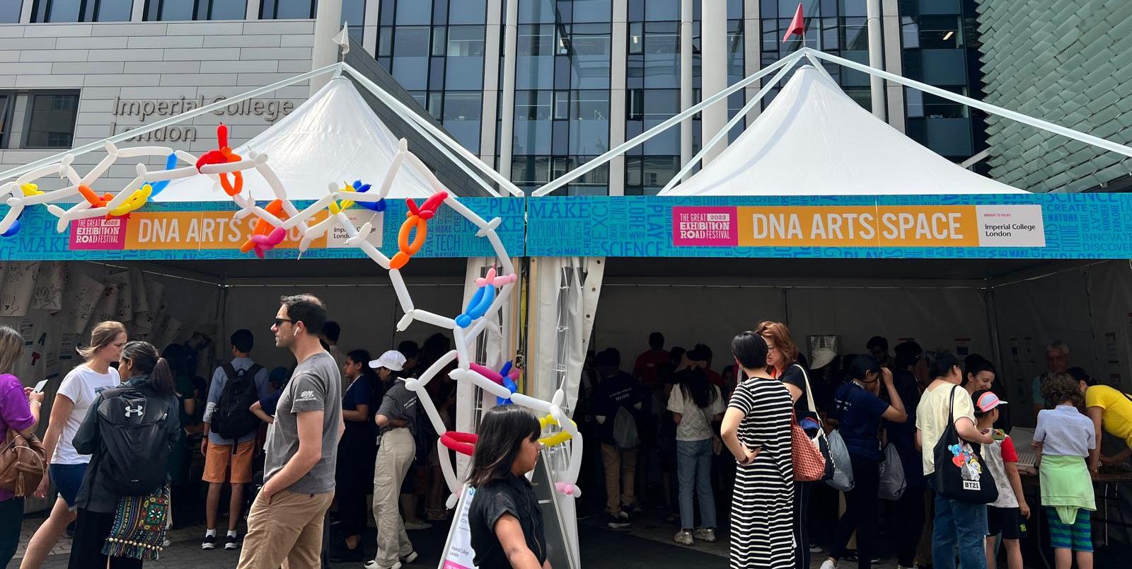 For this year’s festival, we were allocated a premium spot, a marquee on Exhibition Road right outside the Imperial College's main entrance! We were paired with artists Andy D’Cruz and Jonathan Hogg to create a space that celebrated the themes of the festival: science, art and awe & wonder. We were delighted with the collaboration and loved Andy & Jonathan’s balloon DNA helix!