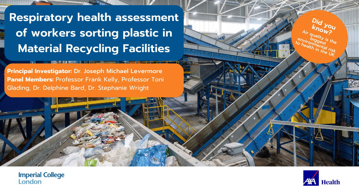 Dr. Joseph Levermore, AXA Fellow at the Imperial College London, intends to conduct a pilot study in pMRFs across the United Kingdom. He will investigate the health impact of occupational exposure to airborne dust resulting from different activities along the recycling chain. He will analyse collected air and human biological samples (blood, urine, and faecal matter) using microscopy and mass spectrometry instrumentation to identify markers for inflammation associated with acute health impacts from airborne dust inhalation.