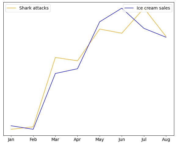 The more likely explanation is that more people eat ice cream and get in the ocean when it’s warmer outside. More people in the ocean means more shark attacks. Temperature is what links ice cream sales and shark attacks. They are not directly linked to each other. Although ice cream sales and shark attacks are highly correlated, one does not cause the other.