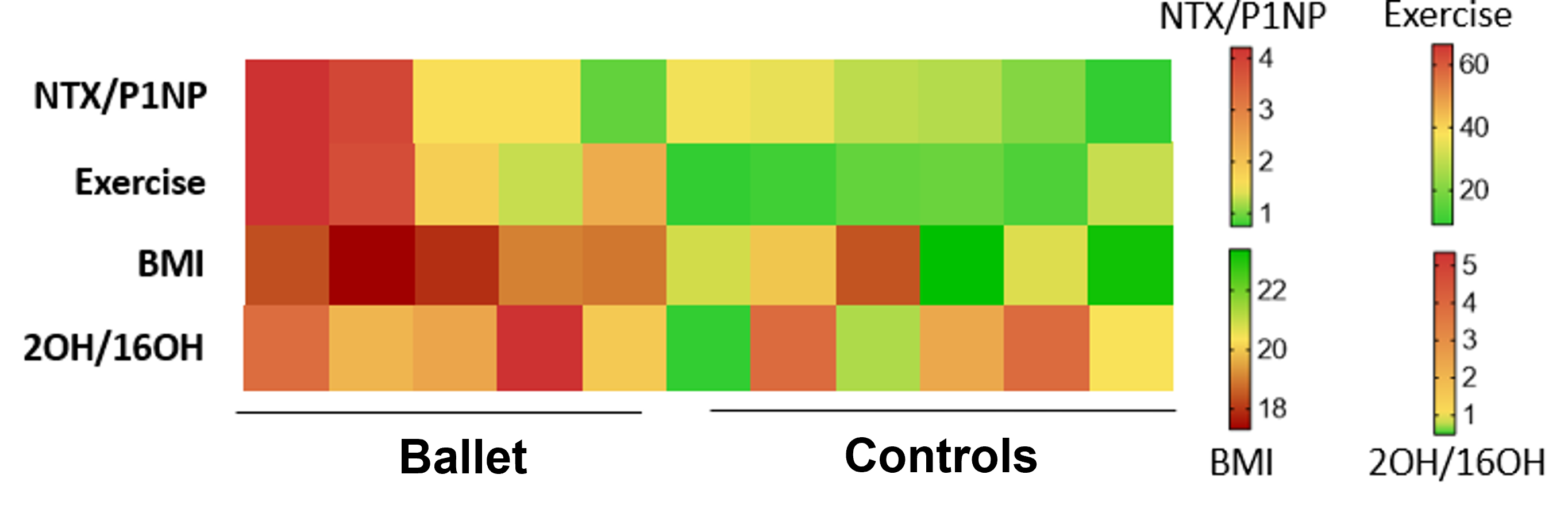 Summary of current research:Diagram showing a physiological comparison between ballet dancers versus controls: bone turnover, BMI, exercise and oestrogen metabolism.