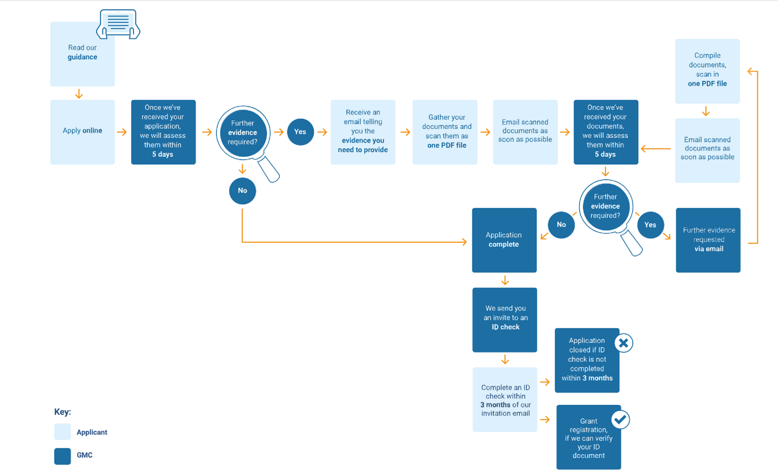 Identity Checks: Once applicants have submitted their documentation and qualifications to the GMC, the GMC will review an applicant’s application for a licence to practice. If an applicant’s application is accepted, they will have to attend a GMC identity check. Applicants will attend their identity check in person at the GMC’s offices.