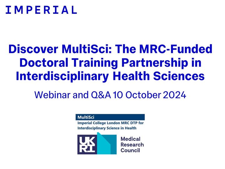 MultiSci is a Medical Research Council (MRC) DTP for Interdisciplinary Science in Health (MultiSci) at Imperial. It has been designed to enable graduates to undertake a 4.5 year training programme, including a research project plus training in research methods and transferable key skills, leading to the submission of a doctoral thesis and the award of a PhD.
