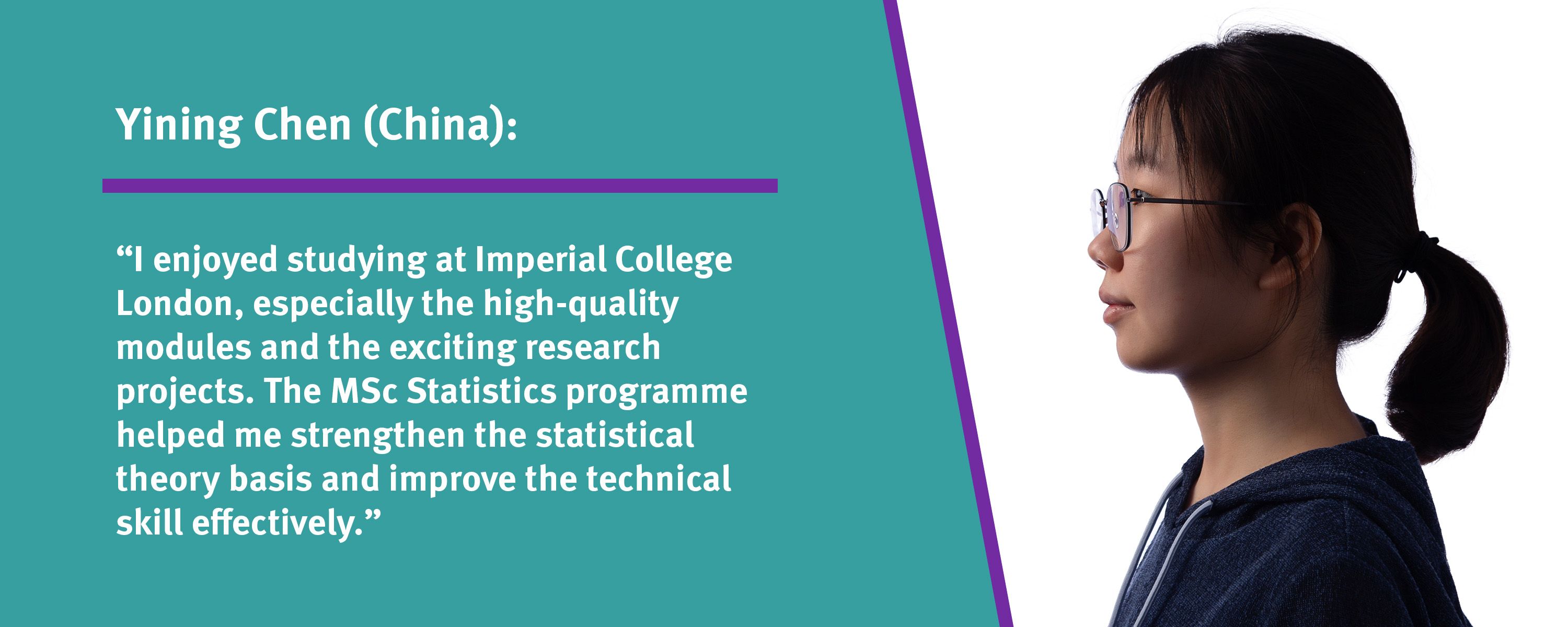 Yining Chen: "I enjoyed studying at Imperial College London, especially the high-quality modules and the exciting research projects. The MSc Statistics programme helped me strengthen the statistical theory basis and improve the technical skill effectively."