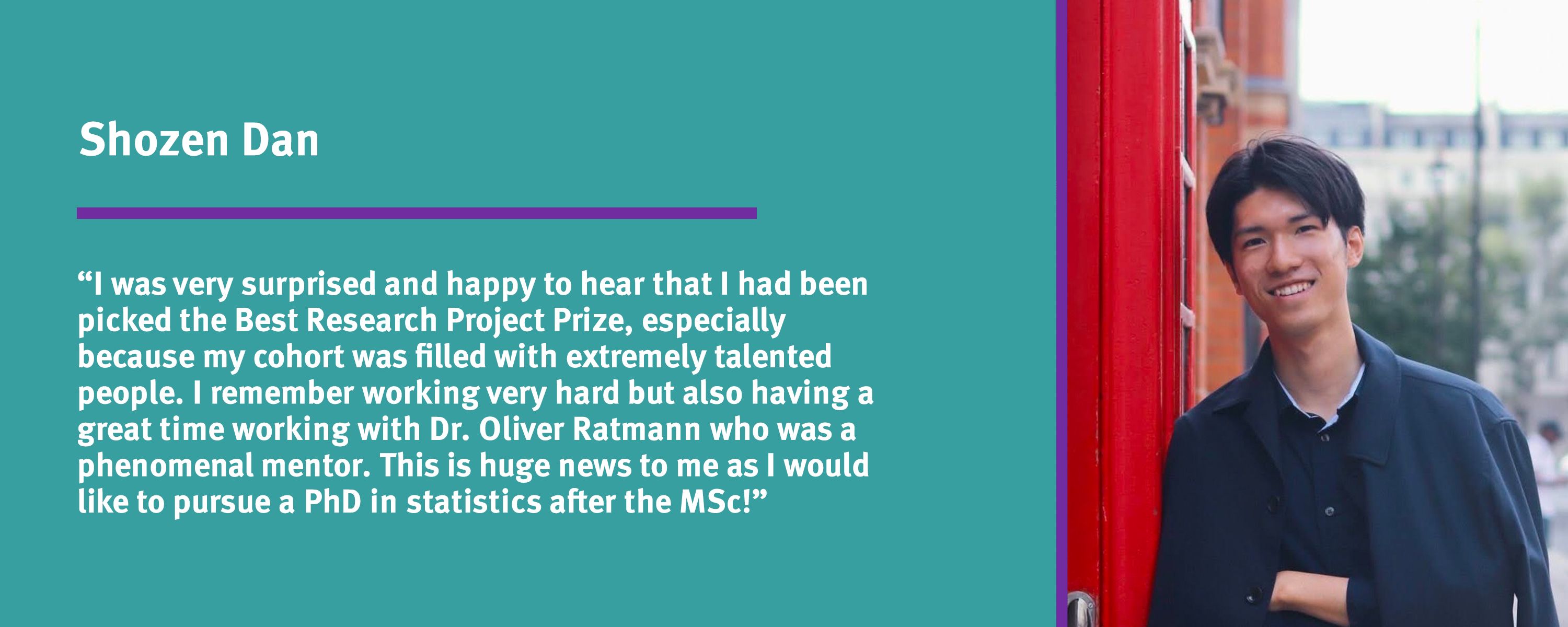Shozen Dan: “I was very surprised and happy to hear that I had been picked the Best Research Project Prize, especially because my cohort was filled with extremely talented people. I remember working very hard but also having a great time working with Dr. Oliver Ratmann who was a phenomenal mentor."