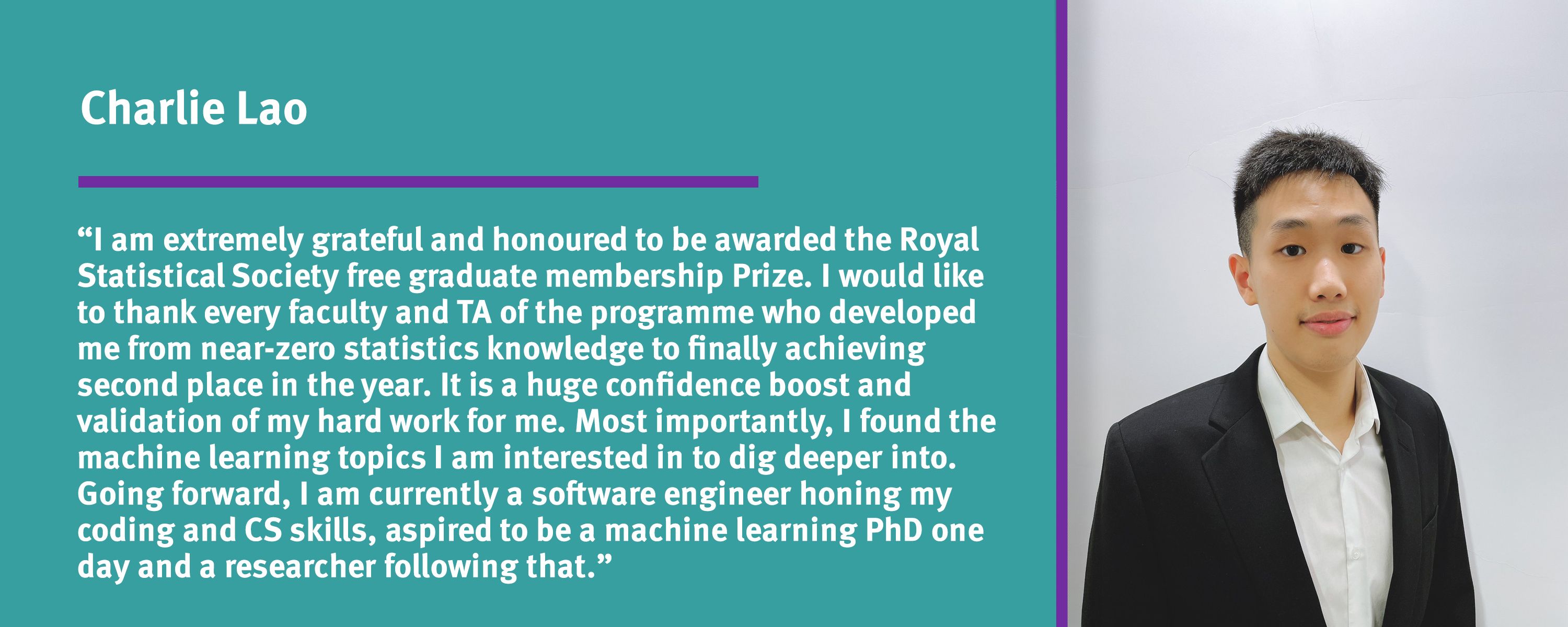 Charlie Lao: I am extremely grateful and honoured to be awarded the Royal Statistical Society free graduate membership Prize. I would like to thank every faculty and TA of the programme who developed me from near-zero statistics knowledge to finally achieving second place in the year.