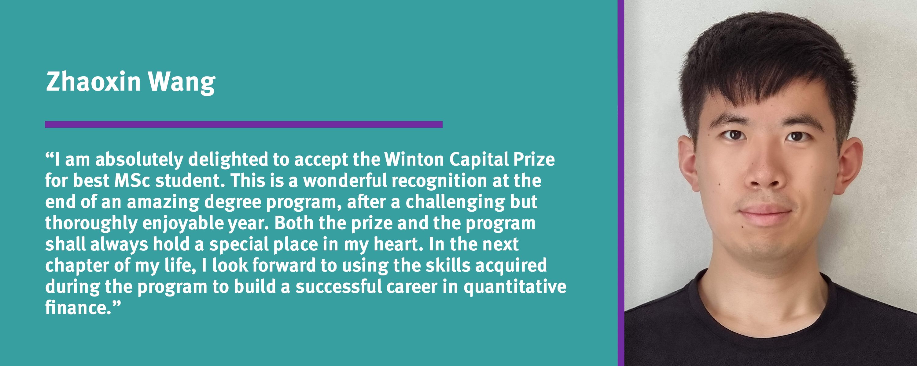 Zhaoxin Wang: I am absolutely delighted to accept the Winton Capital Prize for best MSc student for 2021-22. This is a wonderful recognition at the end of an amazing degree program, after a challenging but thoroughly enjoyable year.