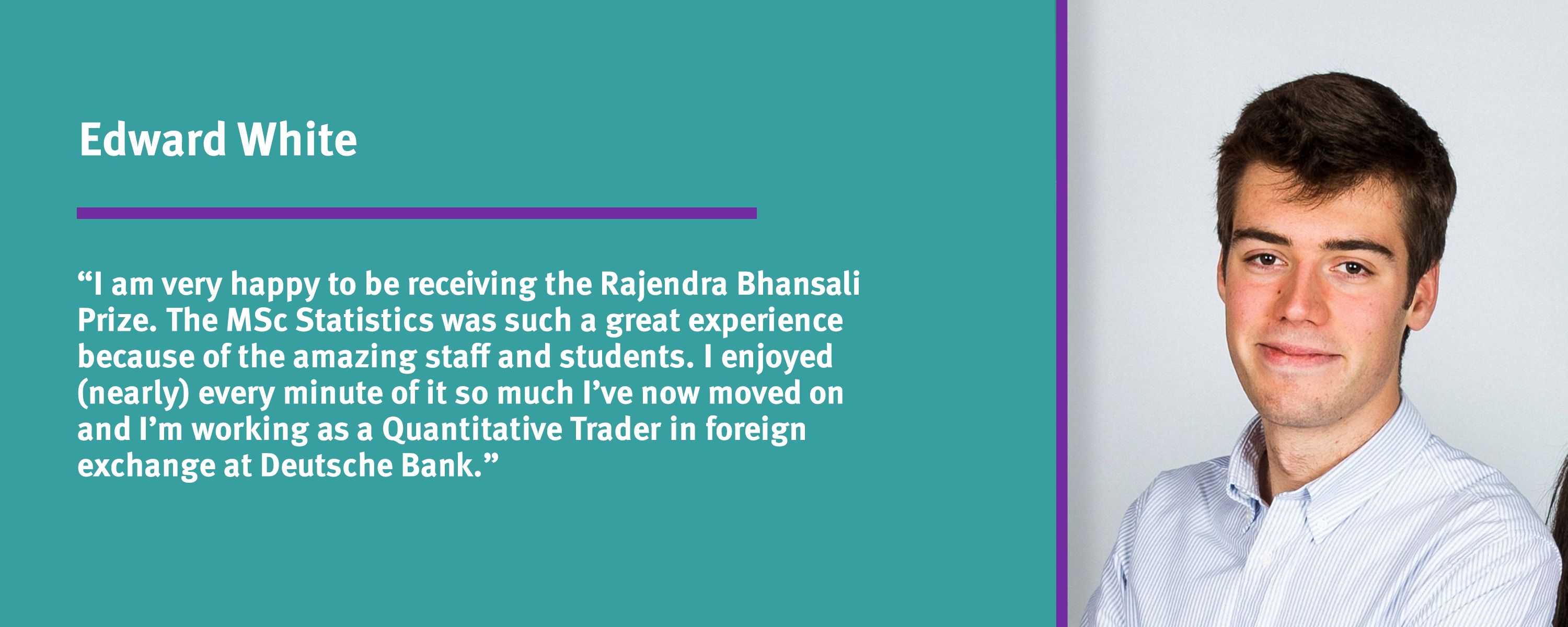 Edward White: "I am very happy to be receiving the Rajendra Bhansali Prize. The MSc Statistics was such a great experience because of the amazing staff and students. I enjoyed (nearly) every minute of it so much I’ve now moved on and I’m working as a Quantitative Trader in foreign exchange..."