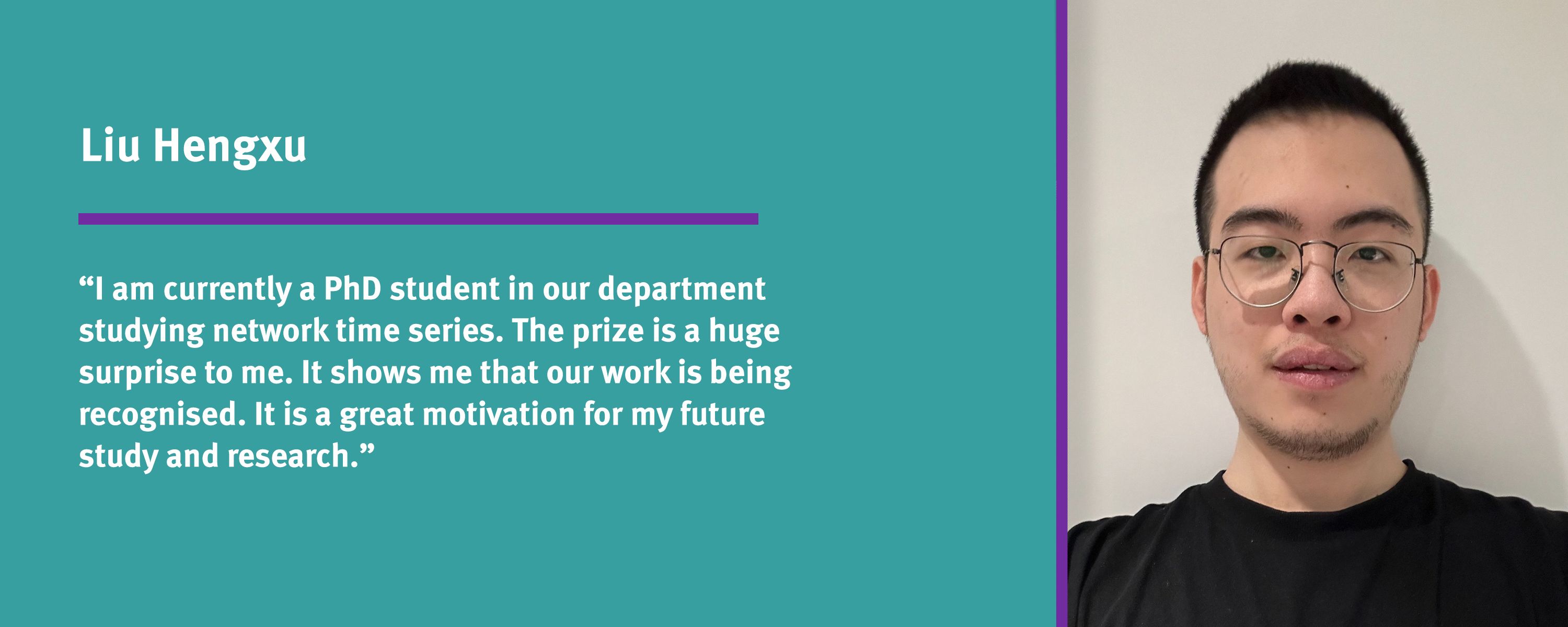 Liu Hengxu: "I am currently a PhD student in our department studying network time series. The prize is a huge surprise to me. It shows me that our work is being recognised. It is a great motivation for my future study and research."