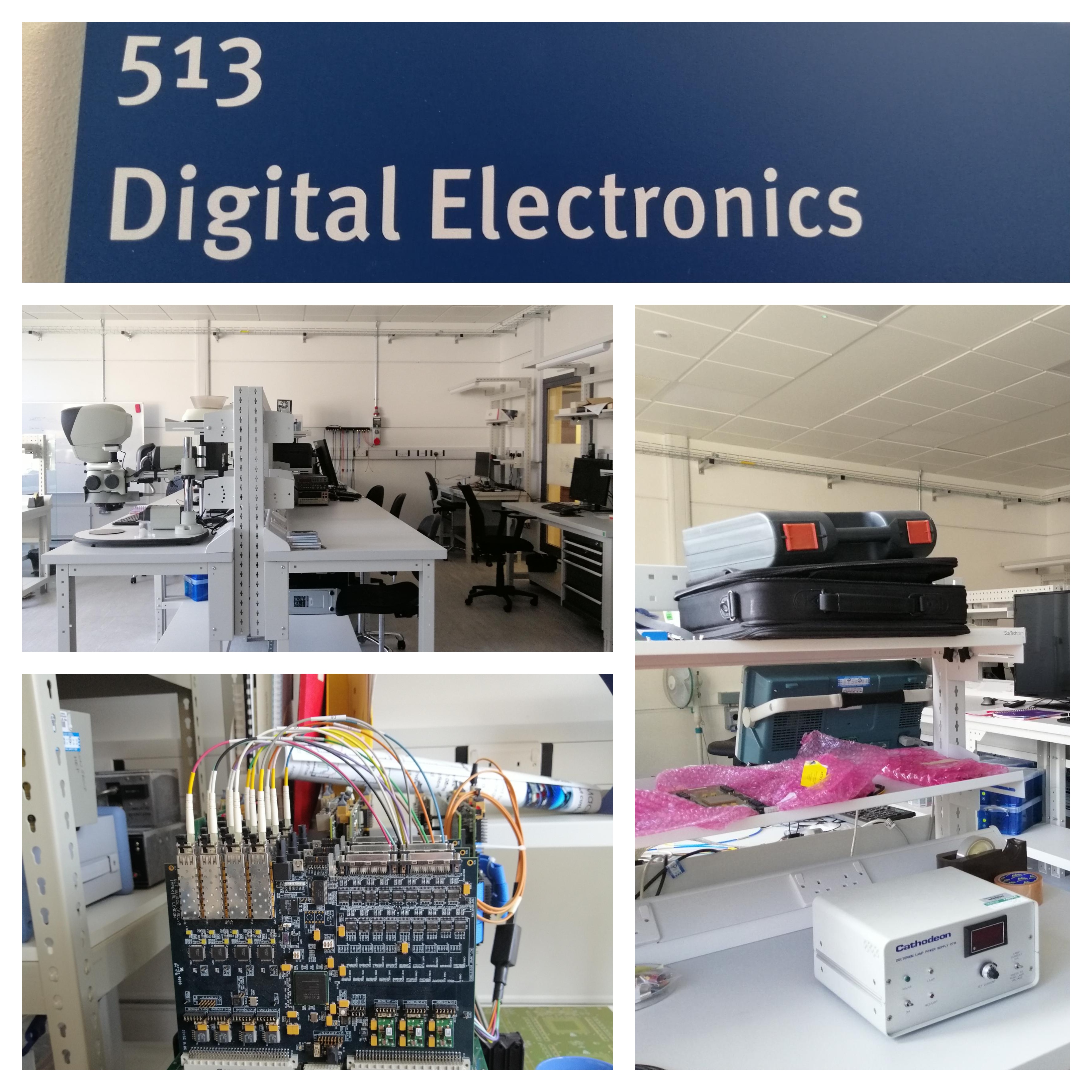 The lab is stocked with all the tools necessary for designing, prototyping and testing electronics and electronic systems: microscopes, oscilloscopes, power-supplies, etc. And for its role as a hub for algorithm development and hardware acceleration, it is equipped with a communal area and whiteboard to encourage and enable design discussion.
