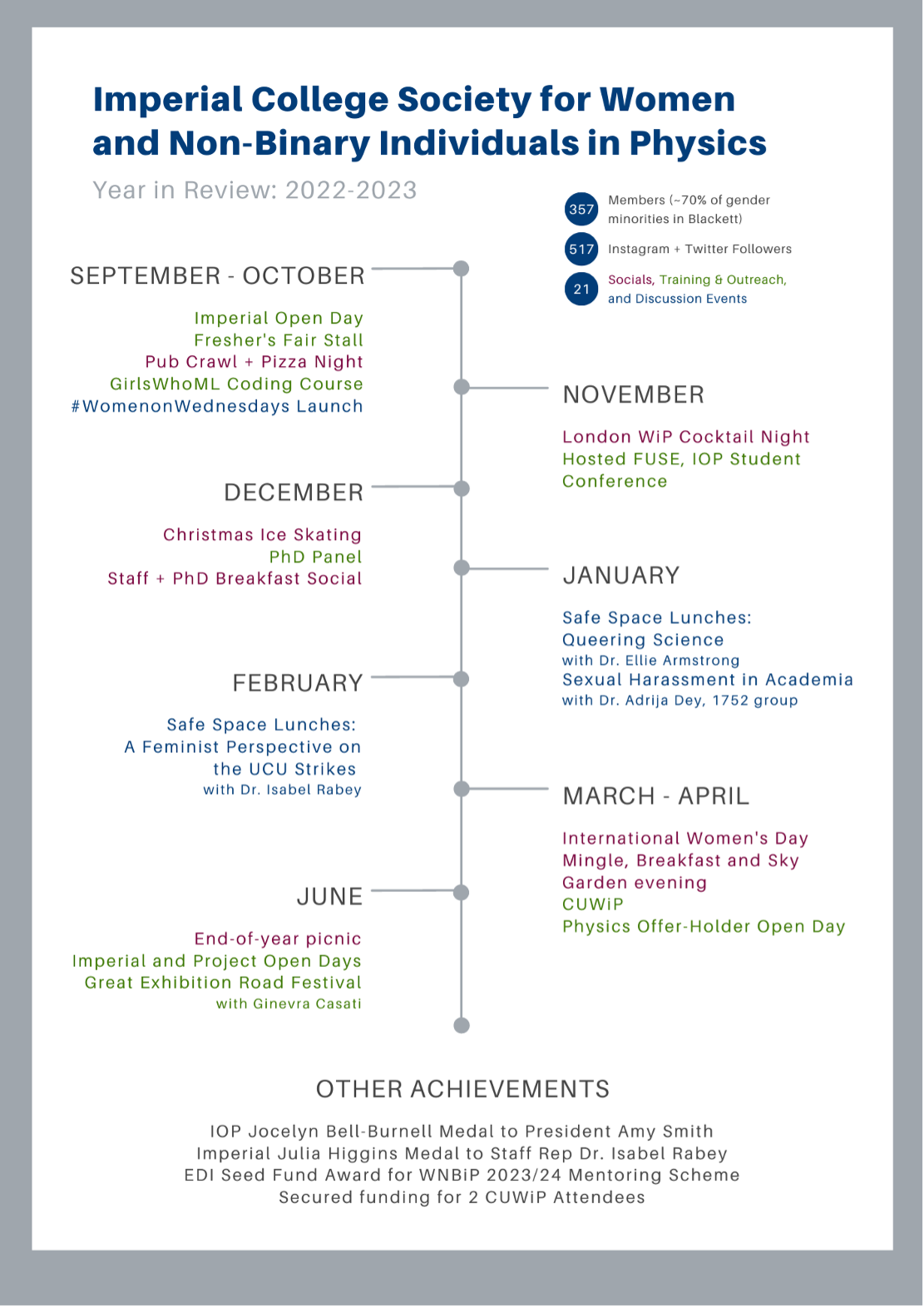 The Imperial College Society for Women & Non-Binary Individuals in Physics aims to create a welcoming, inclusive, and supportive network for women and non-binary people working and studying in physics.