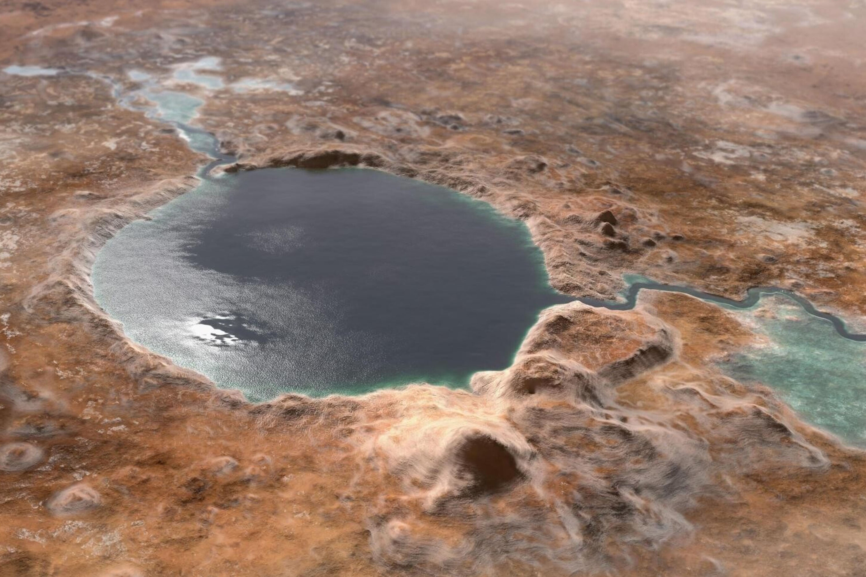 Top image: Illustration of the Jezero Crater as it may have looked billions of years ago, when it was a lake. Credit: NASA/JPL-Caltech