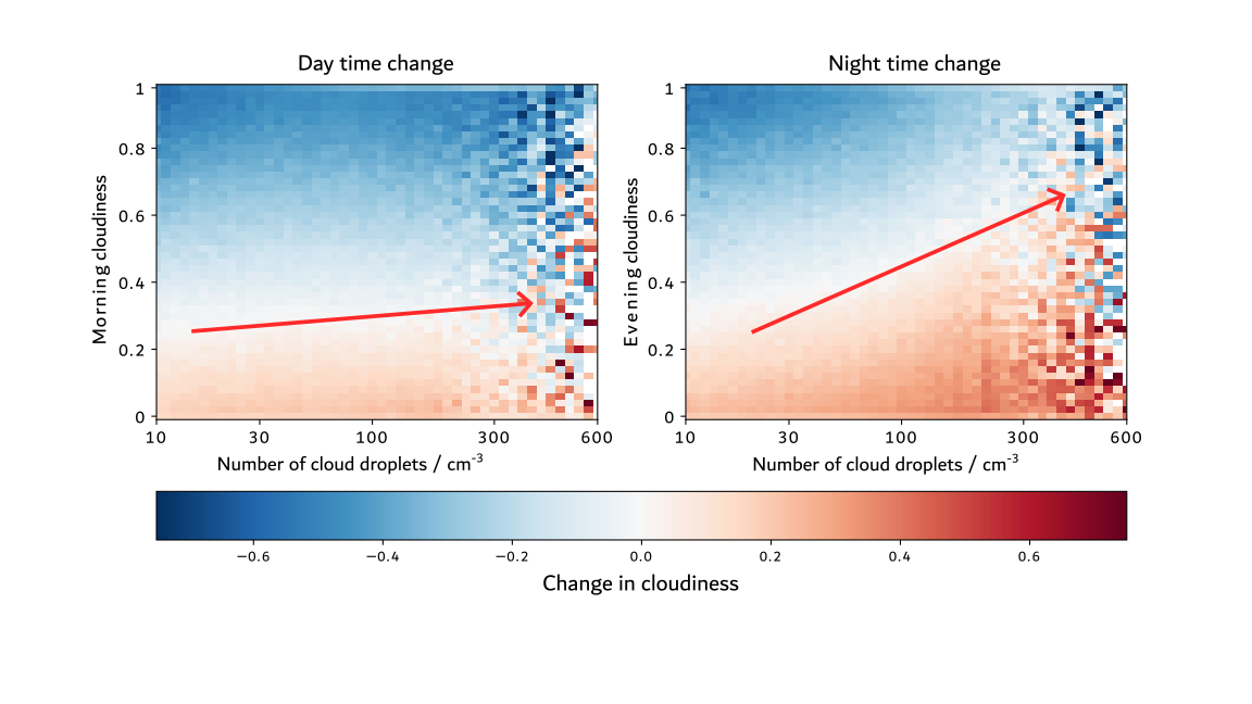 The red arrow below shows the point at which cloudiness goes from increasing to decreasing (red to blue). During the nighttime this is much more sensitive to the number of cloud droplets compared with the daytime (highlighted by steepness of the line; Pugsley et al, 2025)