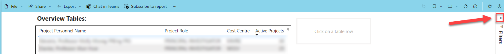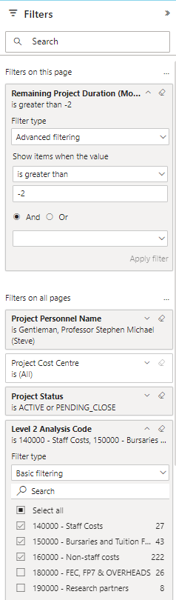 Default view shows all projects with an end date either in future or within the last two months (i.e. the -2 here) To show projects ending in the last two years or beyond “Remaining Project Duration”, click the arrow icon to expand, change to -24 and Apply Filter. You are not responsible for overheads or research partner billing, therefore these are not displayed by default Expand “Level 2 Analysis Code”, tick / untick these top-level finance categories as appropriate Power BI will remember the layout as you leave it. |