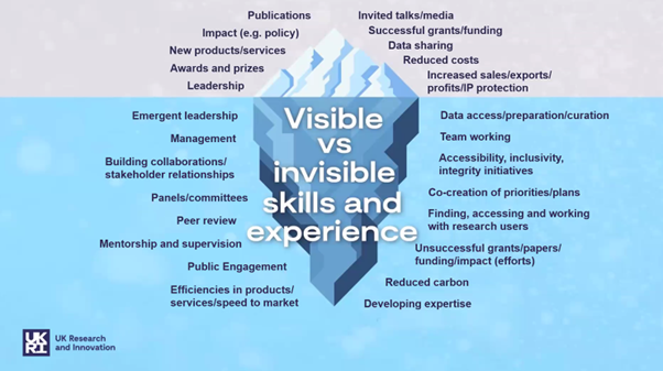 - Use detail to describe roles and skills, even those that might seem less immediately connected to the creation of research. UKRI have identified ‘invisible’ skills and experiences that are just as relevant to the research process as the more ‘visible’ ones and all would be welcome to be included in a narrative CV response.