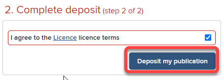 4. Select a version description that matches your paper from the drop-down menu. For more help see Publication versions. Click on Upload or Save location. Read and accept the licence agreement and click on Deposit my publication.