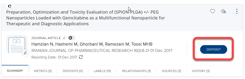 2. Click on the title to open the full record (if you wish to check the metadata) otherwise click on the Deposit tab to open the deposit page.