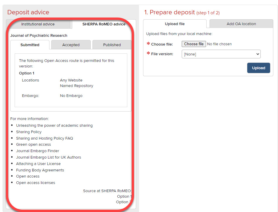 The publisher’s posting policy is available via the Sherpa Romeo guidance on the deposit page to help you to upload the correct version. If no information is available go directly to Sherpa Romeo. Alternatively, contact the Library's open access team or your librarian.
