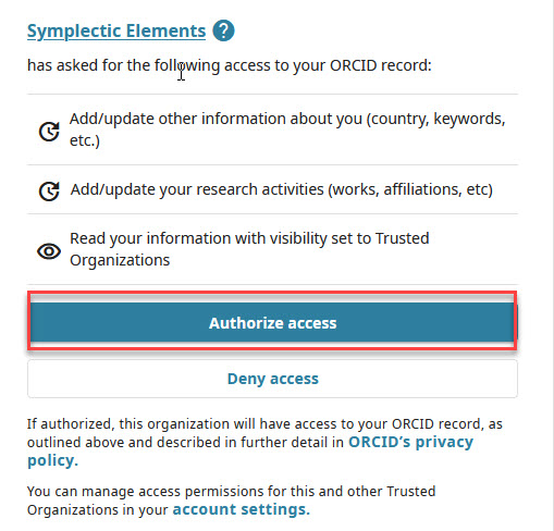 If you do not want to authorise the automatic connection between Symplectic and ORCID, see Setting Symplectic and ORCID permissions.