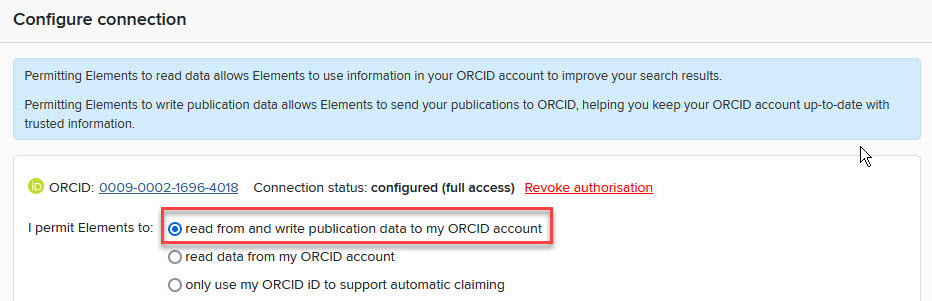 11. Under Configure Connection select the first option I permit Symplectic Elements to read from and write publication data to my ORCID account. Selecting this option will authorise an automatic connection from Symplectic to ORCID, saving you time and administration updating both accounts.