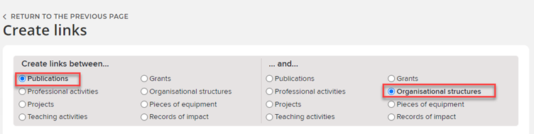 Select the 'Publications' and 'Organisational structures' by clicking the radio buttons.