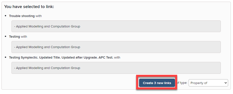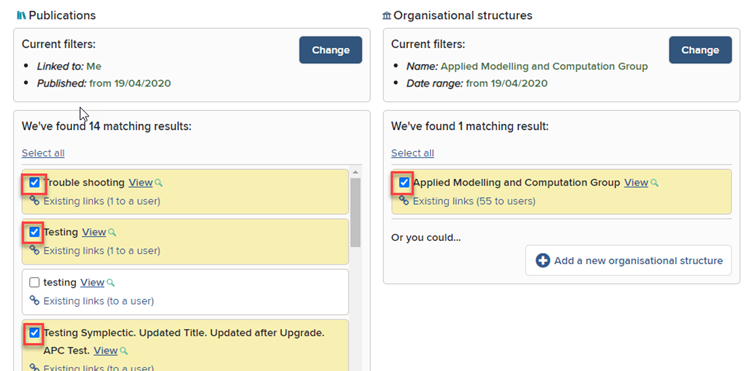 Symplectic will automatically filter both sections to show only your recent publications and organisational structures. You can modify the filters by clicking 'Change'. To create a link between items, click the checkboxes next to the publications you want to link from and the organisational structures you want to link to.