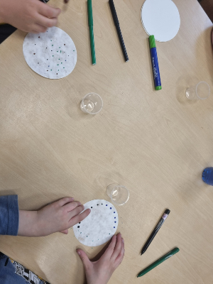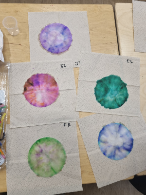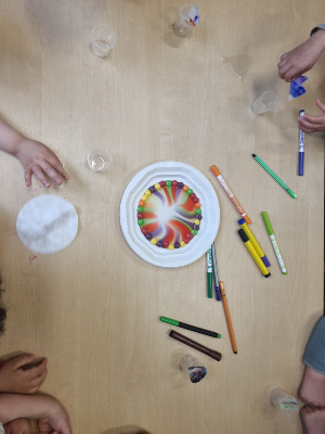 The first activity involved the children drawing dots on coffee filter paper with coloured markers and placing the paper in small cups with water. The second activity involved skittles, the children placed skittles on a plate and poured water over them. The children were amazed to see the different colours drawn out from the skittles and dots marked on the coffee filter.