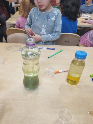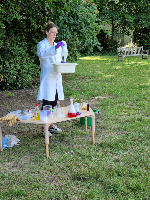 The third experiment involved a lava lamp. The outreach team brought prepared bottles of solution which the children added effervescent vitamin tablet too and observed the different components separating in the bottles. On their second visit, the outreach team organised a dry ice demonstration in the secret garden. Jennifer Cooke explained to the children that carbon dioxide can also be a solid, in the form of dry ice. She prepared activities that showed how dry ice reacts to different components.