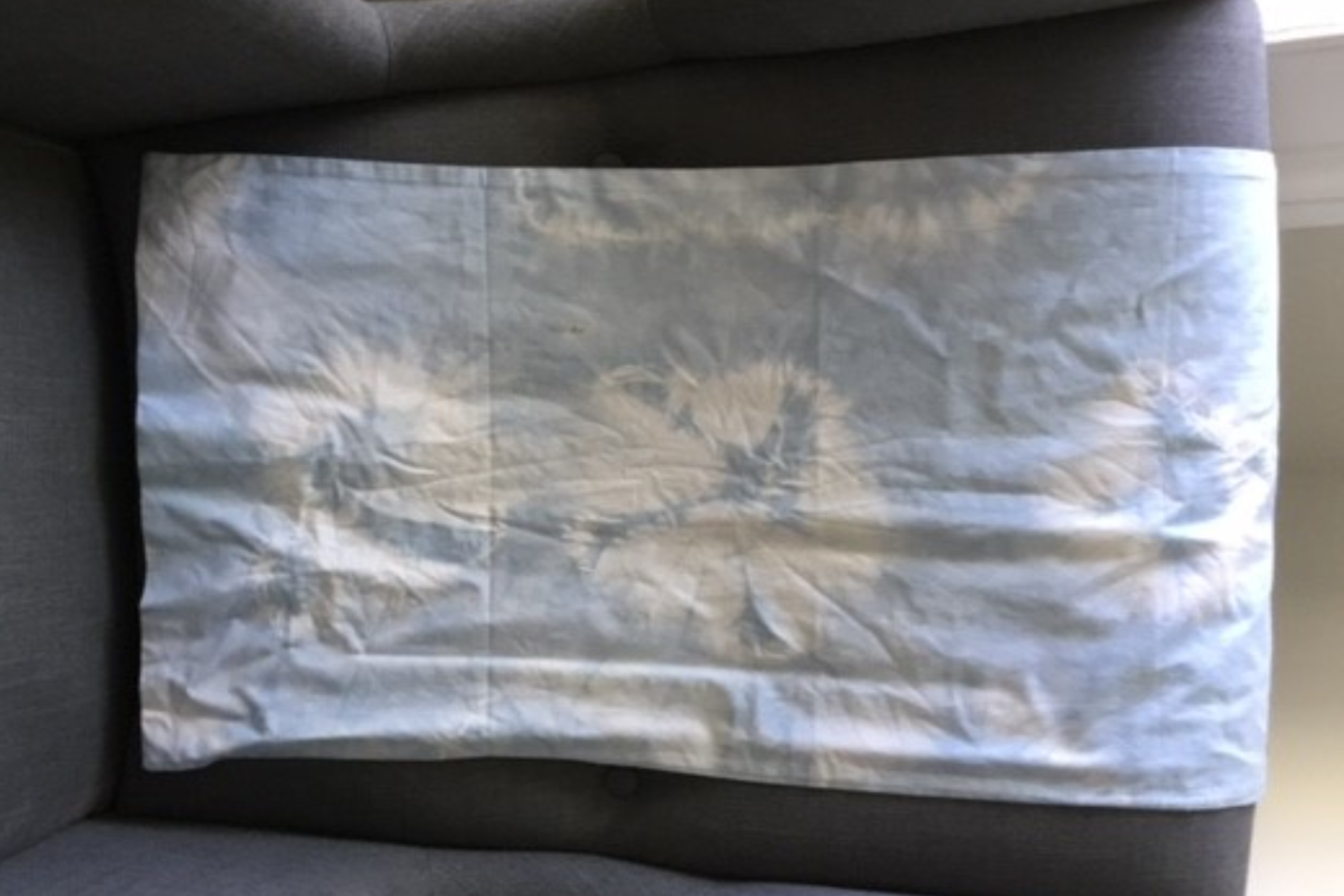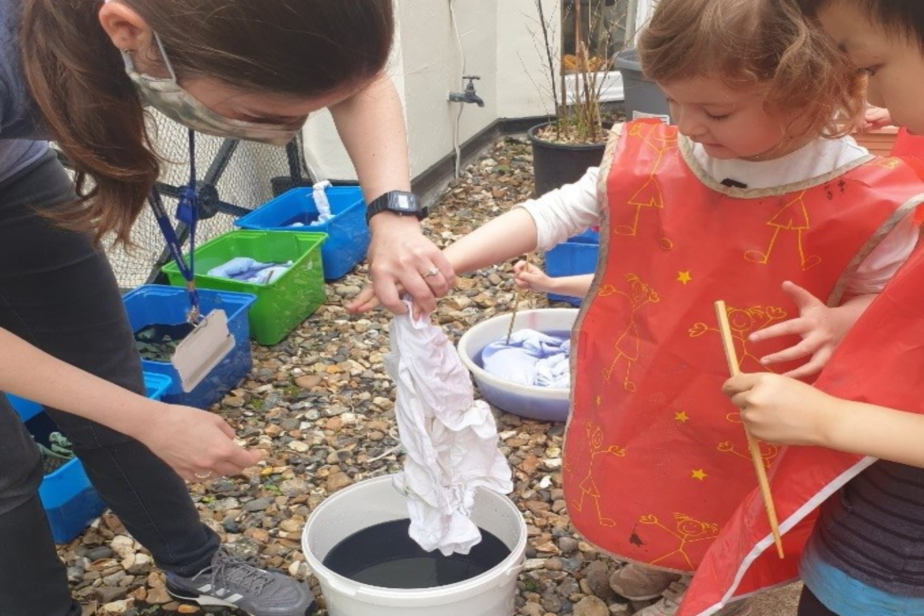 The children were involved in an activity of upcycling old pillowcases by using green and blue tie dye to brighten up and make the children’s book area more cosy.