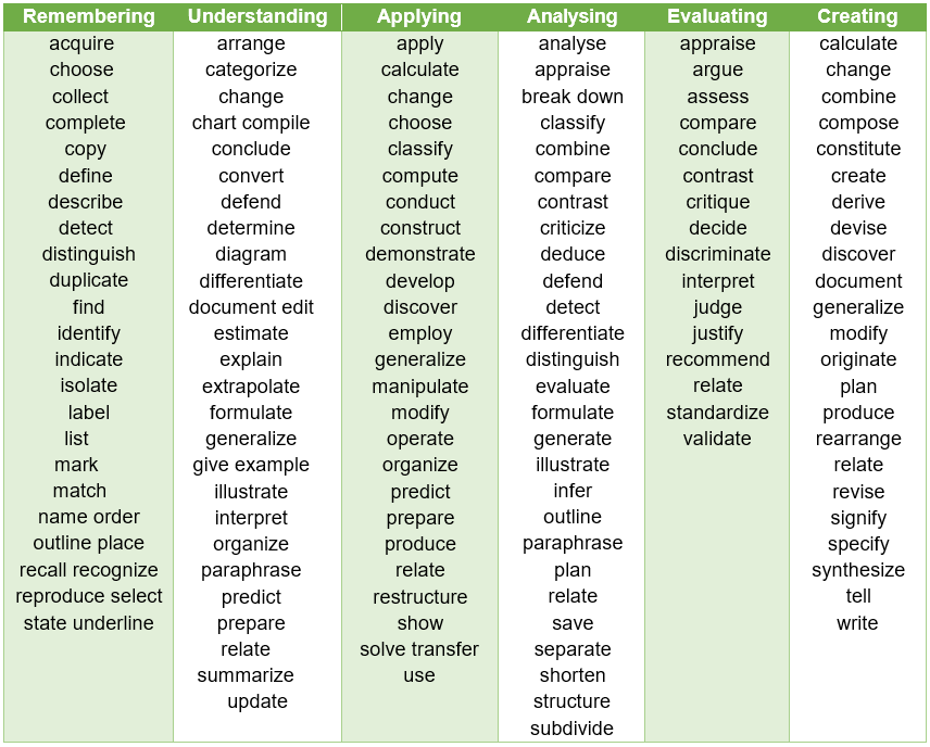 The table below shows how action verbs might relate to Bloom’s levels of learning. You might find it a useful reference when designing your ILOs.