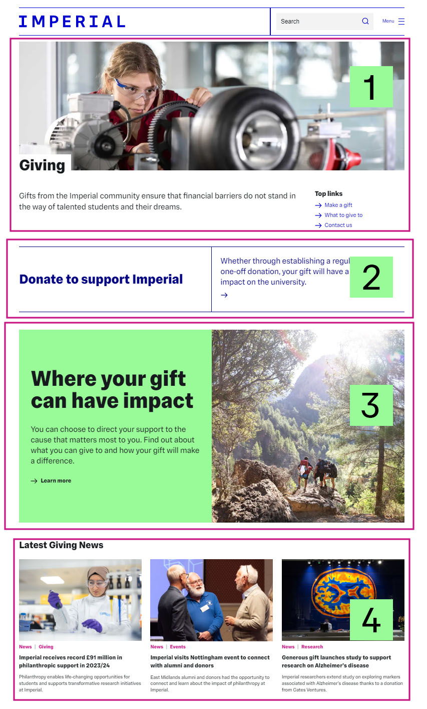 Content types are the building blocks of your web pages and are where you add your content, whether that is text, images or videos. There are many different types of content types including general text and image sections (general content), accordions, column blocks, tabs, buttons and many more. Almost all elements of the website design are available to use on your sections, (the Imperial homepage excepted).