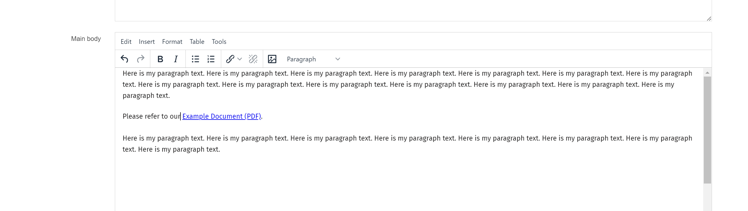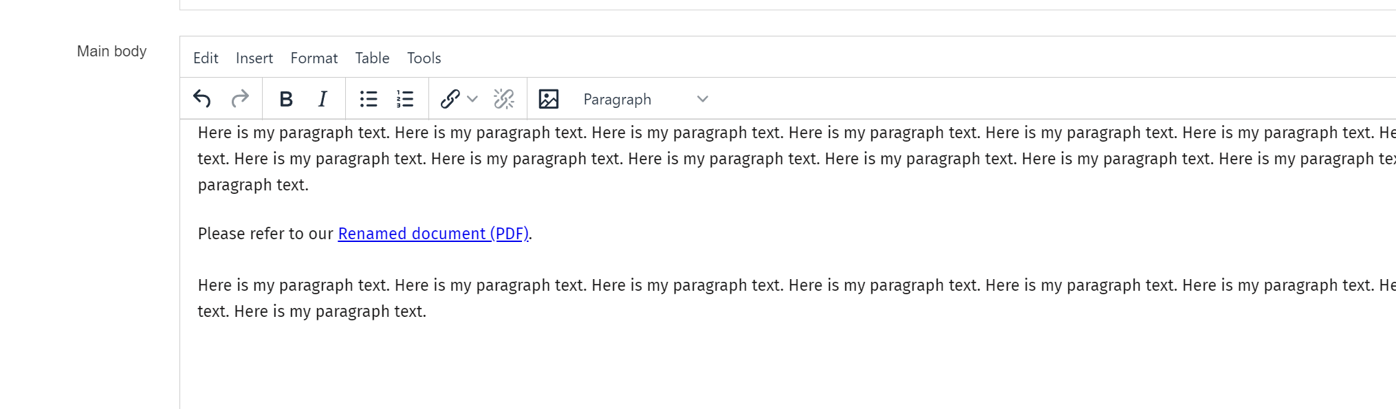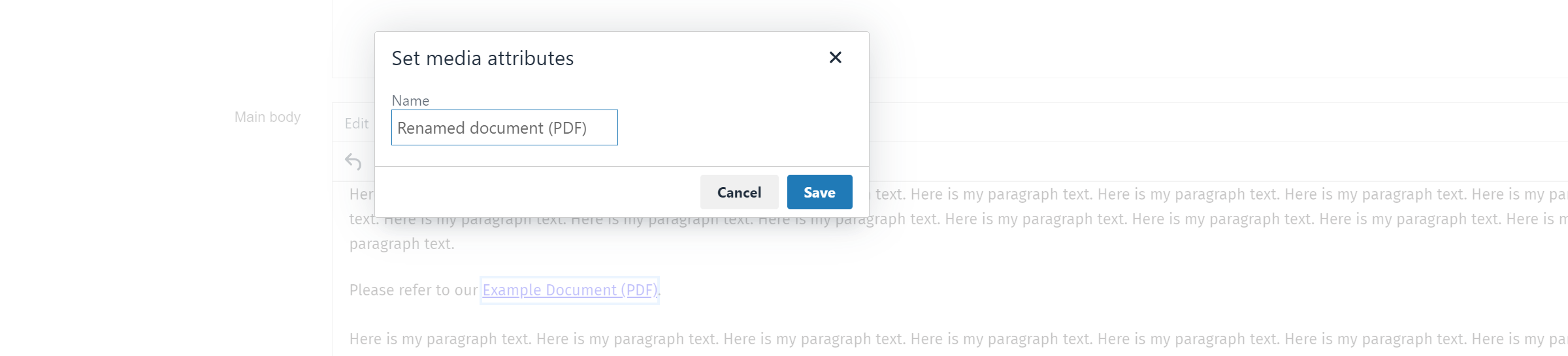 By default the link text will be the name of the document in the Media Library, but you can change this by double clicking on the link in the text editor and then entering your preferred link text in the Name field and clicking Ok. In this example I changed the default name from Example Document (PDF) to Renamed document (PDF).