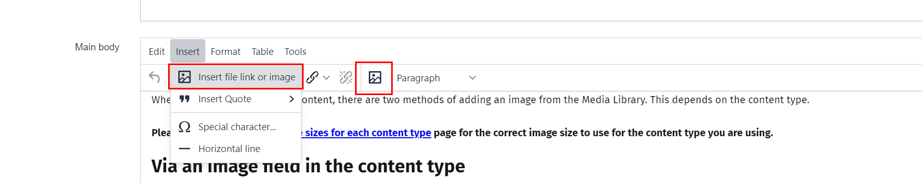 3. Click the Insert file link or image button or go to Insert > Insert file link or image in the menu. Both of these do the same.