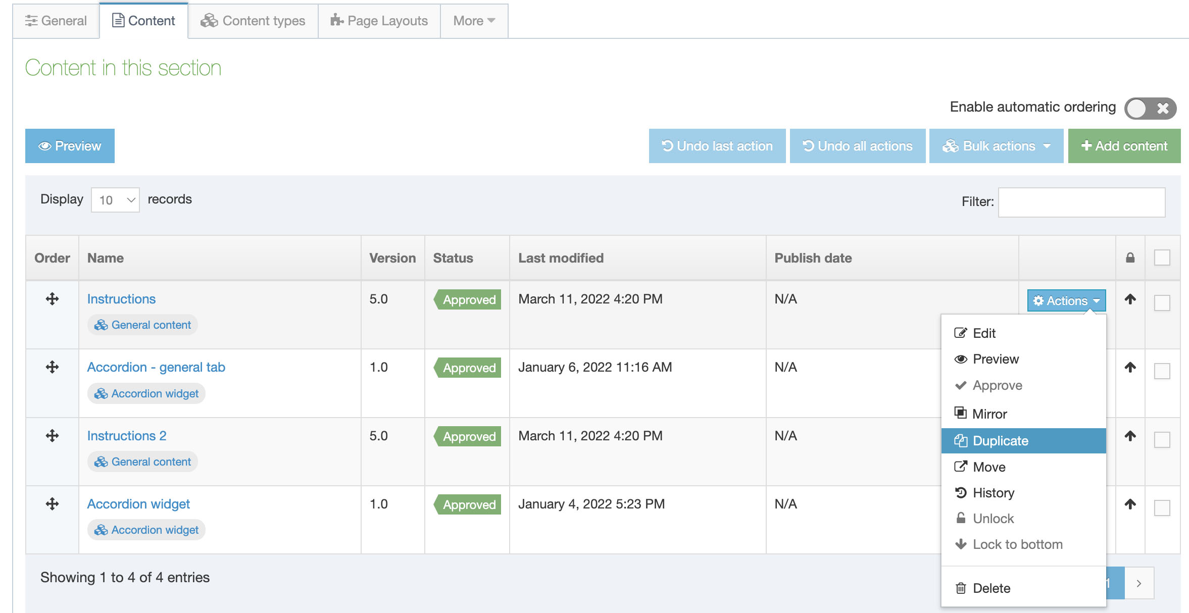 - Duplicate - Create a copy of this piece of content and place it within a section in your site structure. The two versions will be separate.