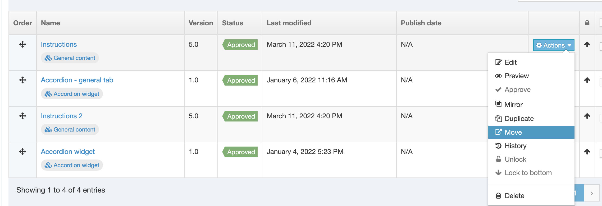 1. For the piece of content concerned, click the blue Actions button and seclect Move from the drop down.