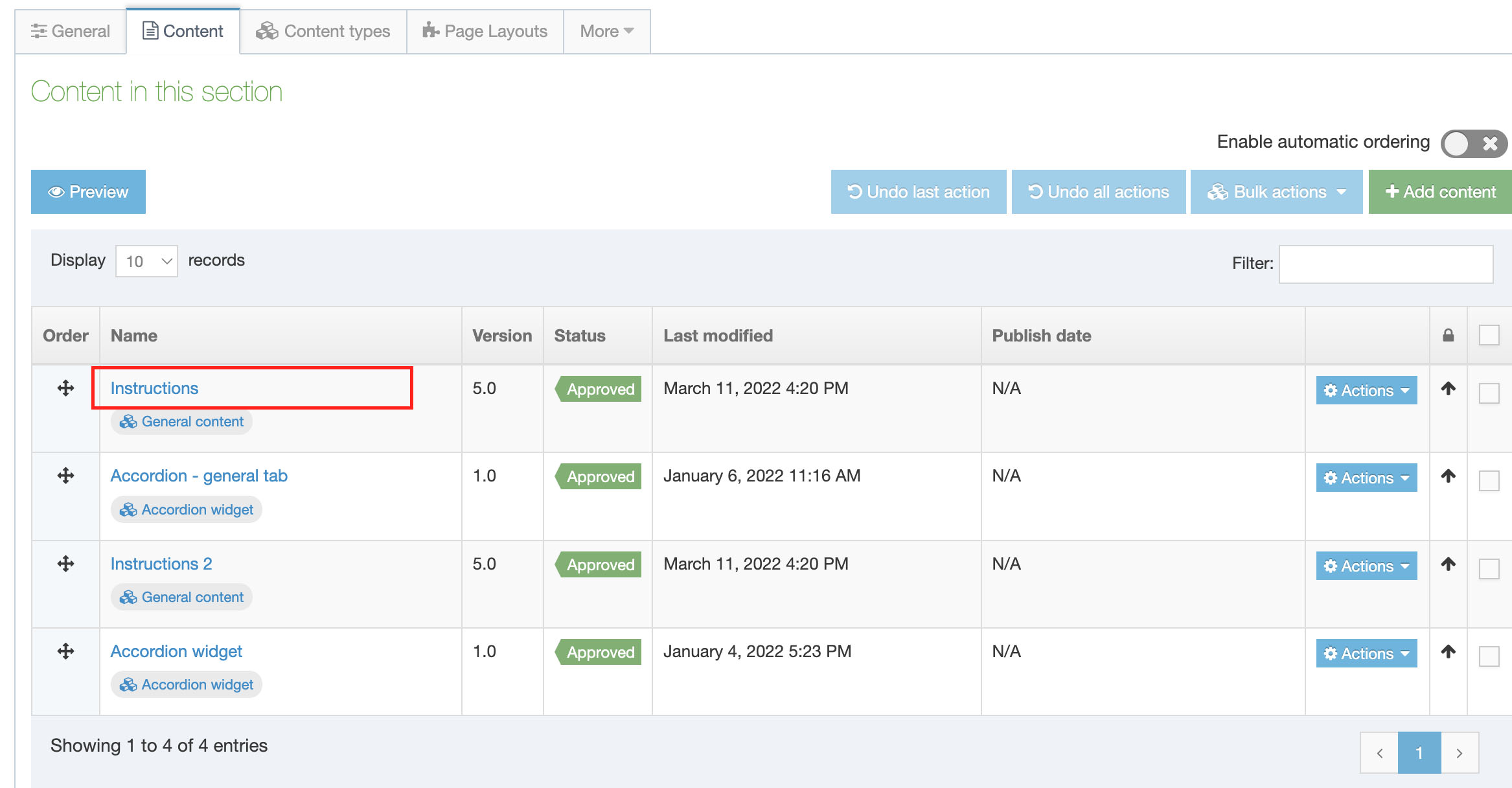 2. Click on the blue Actions button for the page that you wish to add content and select Edit content from the menu;