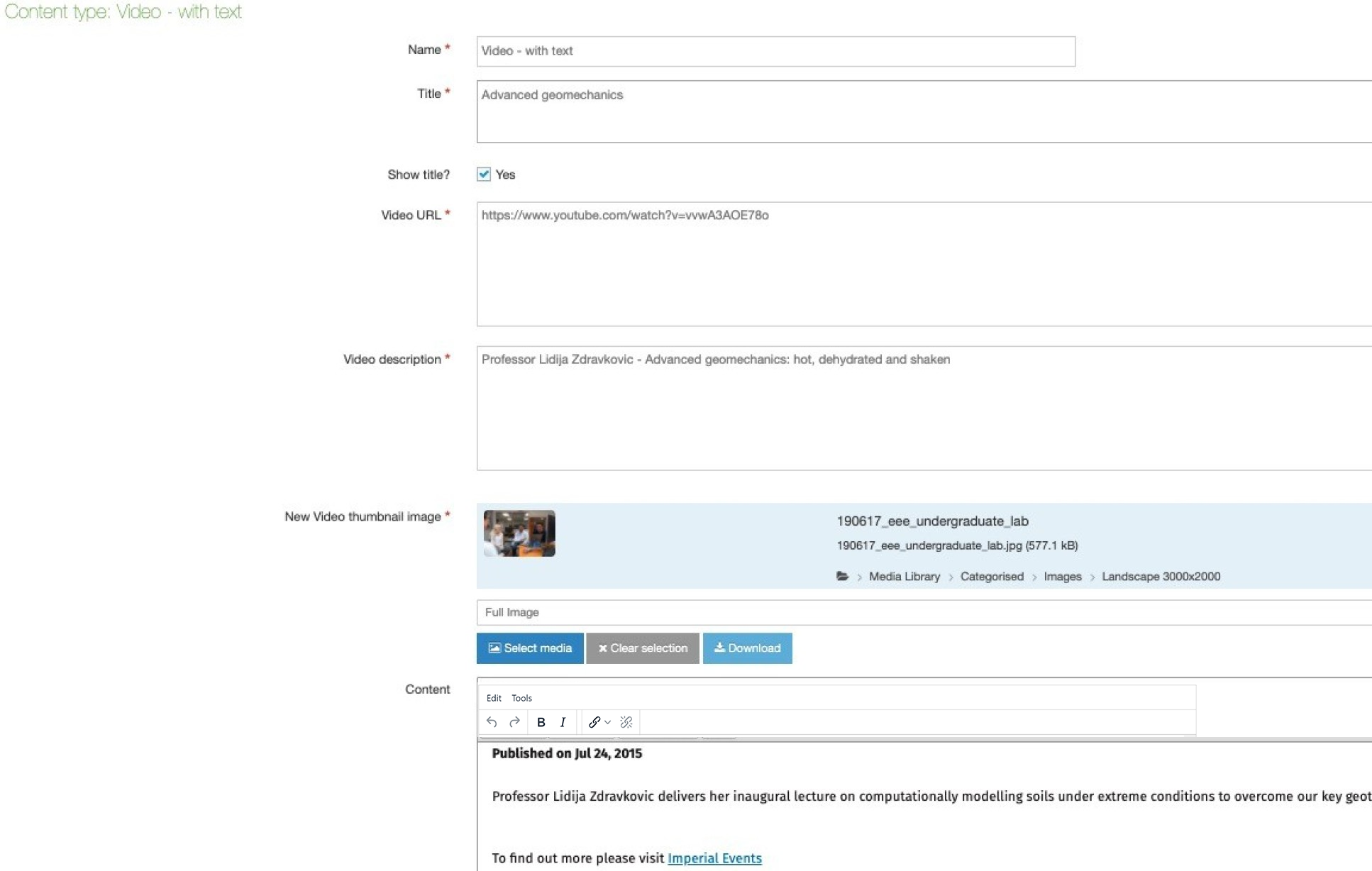 New video thumbnail image * | Adds a placeholder for the image. Click Select media to choose a image from the Media Library or to upload a new image. An image of 3000 pixels (wide) by 1687 pixels (high) is required for this content type, so it should be added to the Non standard-dimensions folder in the Media Library, as this is the only content type that uses these dimensions. Please view the guidance on adding and selecting images in the Media Library. | Yes |