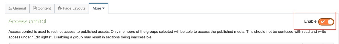 If access controls have been added to the page then the Enable toggle button will be 'on' as shown below.