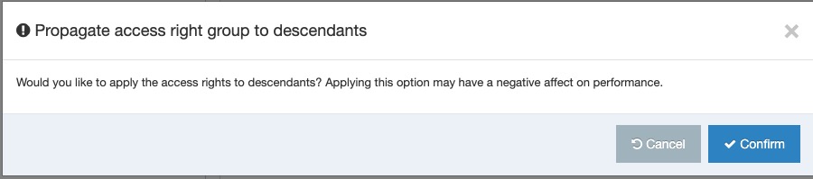 Note: You may receive the warning message below titled Propagate access right group to descendants. This means that by default the restrictions will apply to all descendants (child sections), so you can click Confirm, as that is currently how this is managed on the College website.