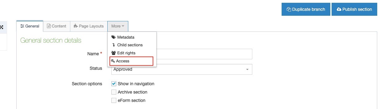 7. Publish the section (or it will publish automatically overnight). Once the page is published the restriction will be in place. See guidance for Publishing your pages (making them live).
