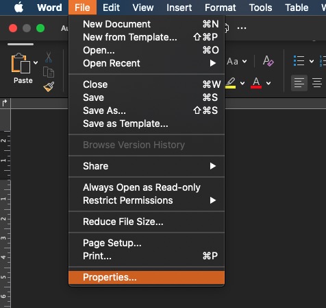 1. With the document open, go to the File menu and click Properties, you will see a screen like the one below: