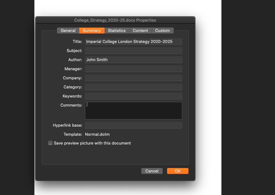 2. Select the Summary tab and enter a descriptive title for the document in the Title field. In this example Imperial College London Strategy 2020-2025.