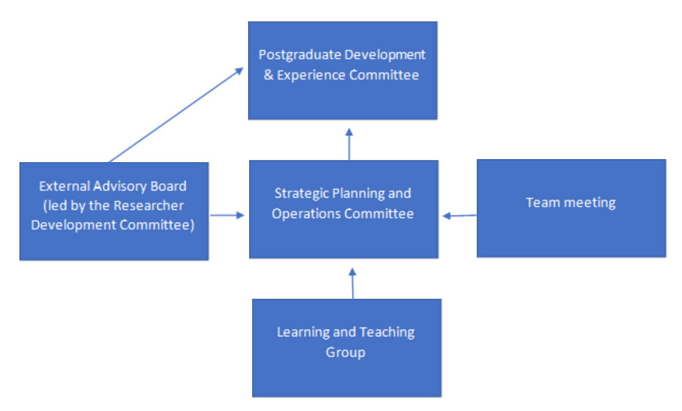 Our Governance structure enables staff and students from across College to contribute towards our strategic direction and the development of our provision. It also assures the quality of our teaching. Our future engagement with the Researcher Development Committee’s External Advisory Board will provide an opportunity to share best practice and to take advice from external stakeholders.