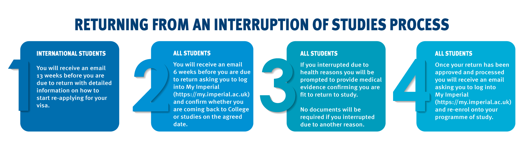 The return process for home students begins six weeks before you are due to return or 13 weeks for international students. Your department will send an email to both your College and personal email addresses. You will need to log into My Imperial and confirm whether you are coming back on the anticipated return date. You will then be able to confirm the date you are planning to come back, ask for an extension of your interruption or withdraw from your studies.